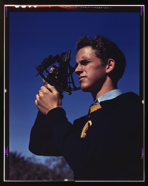 Boys trained in the fundamentals of navigation may become technicians in the armed service, Los Angeles, Calif. Thomas Graham, a member of the Victory Corps at Polytechnic High School, is learning to use a sextant to determine longitude and latitude