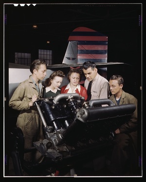 Students at Washington High School at class, training for specific contributions to the war effort, Los Angeles, Calif. Ralph Angar, instructor, explains propeller characteristics to students in the aeronautics class