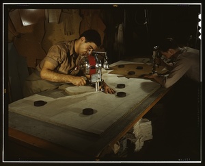 The utmost precision is required of these operators who are cutting and drilling parachute packs in an eastern factory, Manchester, Conn. Their work is under constant close supervision. Pioneer Parchute Company