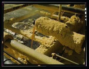 Melted sulphur from the wells pouring into relay station, Freeport Sulphur Co., Hoskins Mound, Texas
