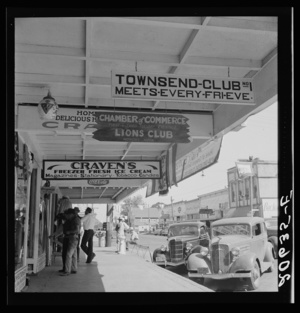 Main street, in front of Oregon Employment Center office. Man with blanket roll is Indian, come to find job in hop fields. Independence, Polk County, Oregon. See general caption number 45-111