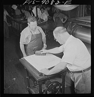New York, New York. Composing room of the New York Times newspaper. Paper mat is made in "rock crusher" and inked for visibility