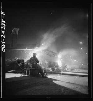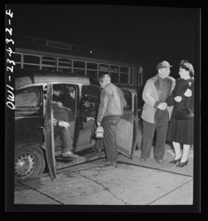 Baltimore, Maryland. Third shift defense workers being picked up by a car pool around midnight