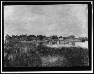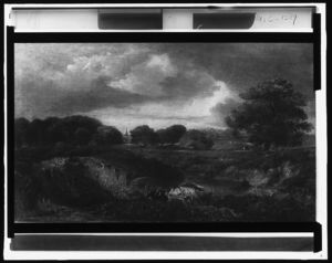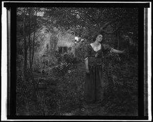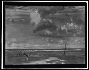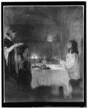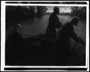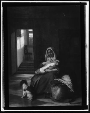 Saint, possibly Virgin Mary, standing on cloud surrounded by cherubs