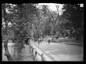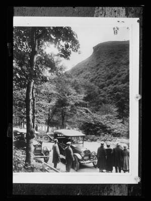 Tourists gazing at Old Man of the Mountain, White Mountains, N.H.