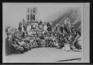 Passengers posed on deck of steamship in passage with steep cliff behind
