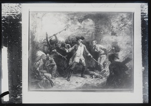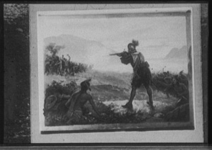 European man in metal helmet firing on Indians while other Indians watch