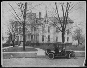 Three-story house with side porch and automobile in front, possibly Detroit, Mich.