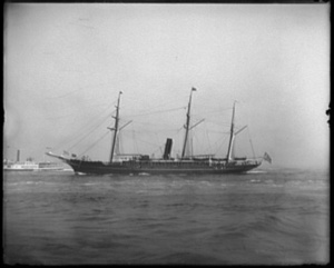 Broadside view of three-masted schooner Niagara, with riverboat Mount Hope in background