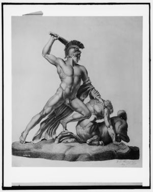 Nude warrior with helmet battling centaur