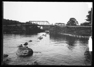 Bridge and trolley car line by water, probably Lake Winnipesaukee, N.H.