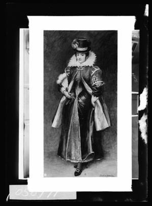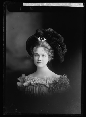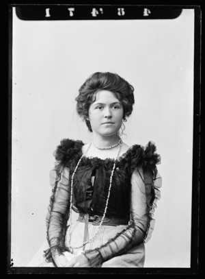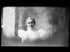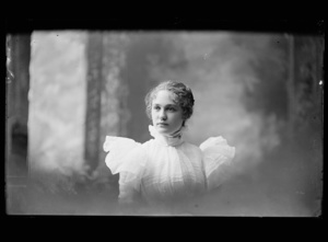 Louise Jackson in blouse with transparent sleeves, half-length portrait