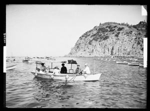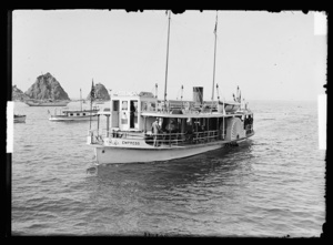 Empress, side wheeler, approaching Catalina Island harbor, Calif.