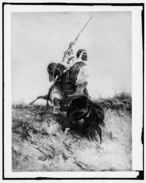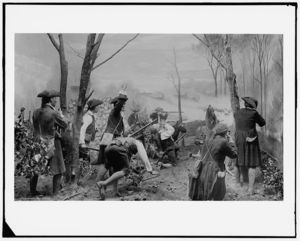 Colonial soldiers engaged in battle in a forest, possibly during the American Revolution