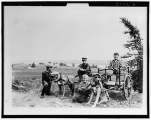 Boys posed with dog carts in field