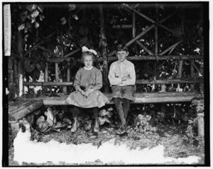 Boy and girl seated in rustic arbor