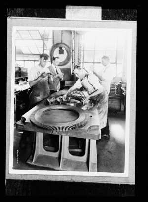 Factory workers on assembly line for bearings