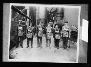 Men wearing gas masks standing in industrial building