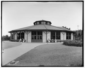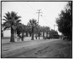 Electric car at Ye Alpine Tavern, Mount Lowe Railway, Mount Lowe, Calif.