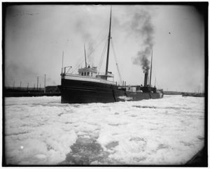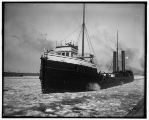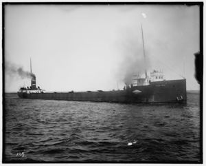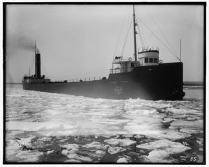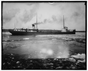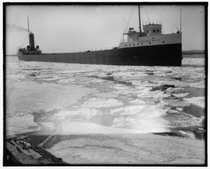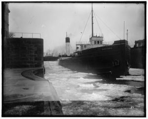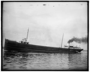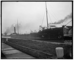 Freighter under steam, possibly Saint Marys River, Michigan