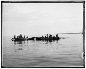 Fishermen in boats pulling in net