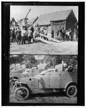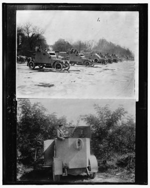 Soldiers unloading armored car in village ; Row of armored cars