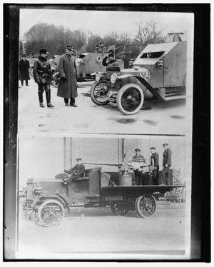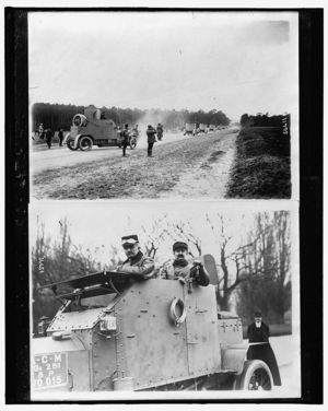 Armored cars on maneuvers ; Two soldiers in armored car