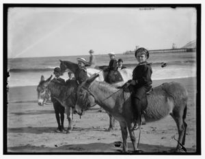 Children riding donkeys at a beach