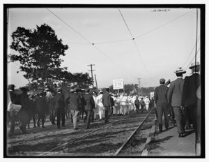 People marching with sign, "Oldest living graduates, 1796"