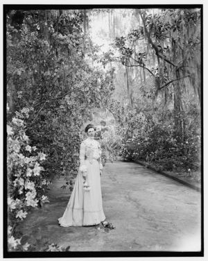 Woman near flowering shrub at Magnolia Gardens, Charleston, S.C.