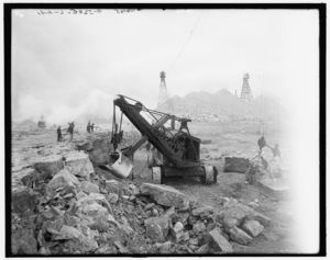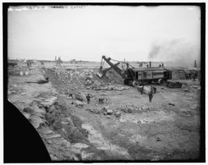 Steam shovel & corner of excavated area, Livingstone Channel, Mich.