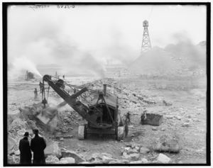 Steam shovel removing rock loosened by dynamite, Livingstone Channel, Mich.