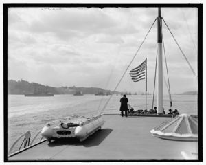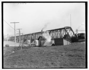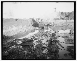 Steam shovel removing a section of coffer dam, Livingstone Channel, Detroit, Mich.