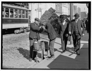 Man lighting cigarette for another on city street