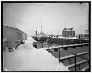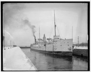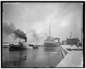 Cargo ship and tug in canal, probably Sault Sainte Marie Canal