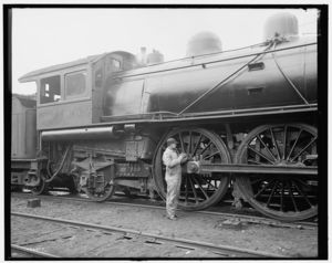 Railroad engineer oiling up before the start