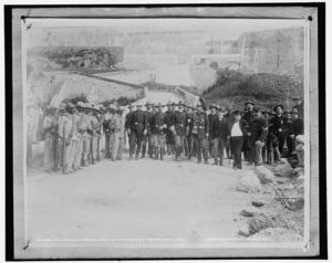 Spanish troops leaving the ordnance store and work shop, Havana, Jan. 1, 1899