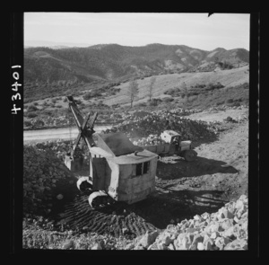 New Idria, California. A power shovel loading mercury ore, called cinnabar, at an open-cut mine of the New Idria Quicksilver Mining Company