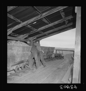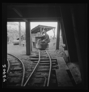 New Idria, California. Loading cinnabar, an ore containing mercury and sulphur, into a mine car with a mechanical loader. Triple-distilled mercury is produced from the ore at the New Idria Quicksilver Mining Company