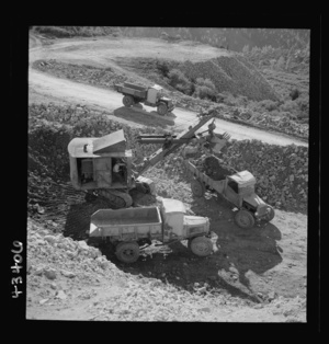 New Idria, California. Trucks, shovel, and crane used in loading cinnabar, an ore containing mercury, at an open-cut mine of the New Idria Quicksilver Mining Company's workings