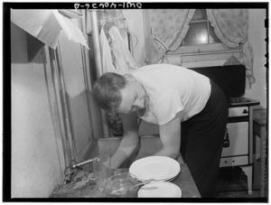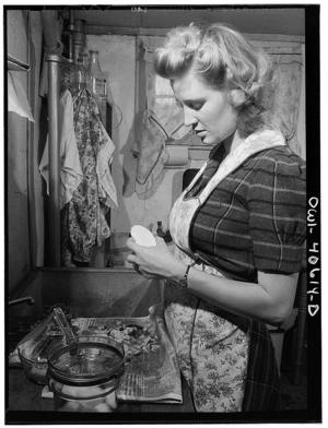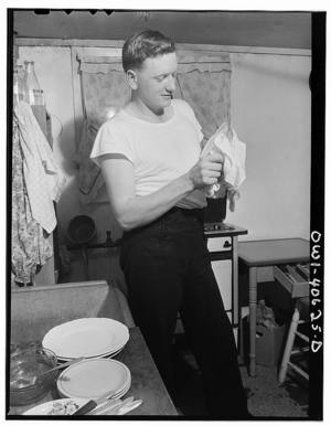 Washington, D.C. After dinner, Hugh Massman, a second class petty officer who is studying in Washington, does the dishes while Lynn feeds the baby