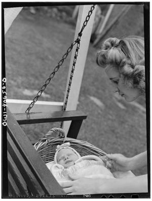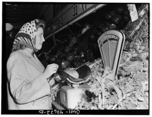 Washington, D.C. Lynn Massman, wife of a second class petty officer who is studying in Washington, shopping for groceries. While Lynn shops, her landlady keeps an eye on baby Joey