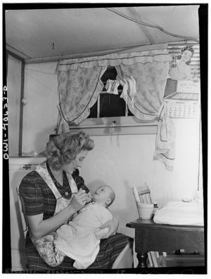 Washington, D.C. Lynn Massman, wife of a second class petty officer who is studying in Washington, D.C., feeding an eight weeks old son cereal