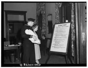 Washington, D.C. Hugh and Lynn Massman consulting the directory of the United Nations Service Center. Newly arrived in Washington, they find they can leave their baby in the nursery while they go sightseeing