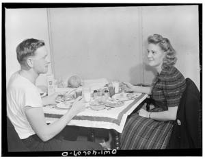 Washington, D.C. Hugh and Lynn Massman eating lunch at a cafeteria after a day of sightseeing. Their eight-weeks-old son is being taken care of at the United Nations service center nursery