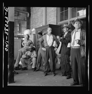 A Greyhound bus trip from Louisville, Kentucky, to Memphis, Tennessee, and the terminals. At travelers' aid desk in the bus terminal at Memphis, Tennessee. Servicemen ask for help in finding rooms, quickest route to get home, etc.