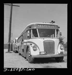A Greyhound bus trip from Louisville, Kentucky, to Memphis, Tennessee, and the terminals. M.P. (Military Police) on duty at the bus station at Memphis, Tennessee