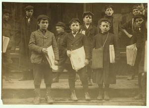 Some of the smaller newsboys, 9, 16 and 11 years old. Location: New Haven, Connecticut.
