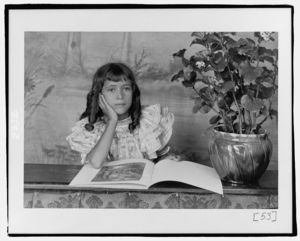 Daughter of Thomas E. Askew, head-and-shoulders portrait, seated, right hand on cheek, with open book