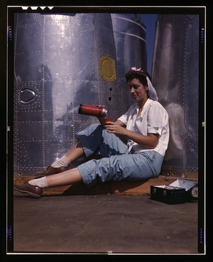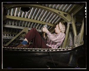 Riveter at work at the Douglas Aircraft Corporation plant in Long Beach, Calif.